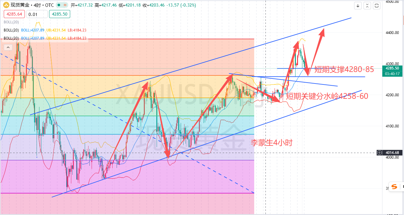 总而言之,整体思路下来日内操作建议,短线方面4280-85多下破58损(轻仓)目标4318-20破位看43450-60破位持有!空谨慎。4260-58多下坡47损(标准仓)目标4300-(4345-50)破位持有!4258不失守不能定义宽幅震荡。依旧保持高位整理时间换空间处理!(对行情把握不好的朋友可以咨询蒙生实盘,蒙生会根据不同的资金提供稳定的操作方案!)