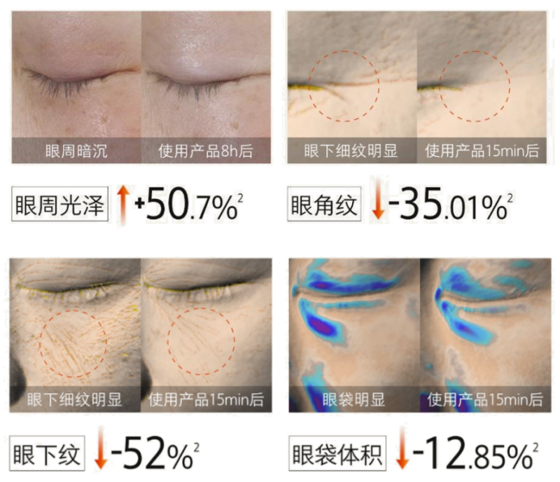 数据源于第三方检测报告(微谱SHA01-25030581-JC-02)32名受试者使用8h、15min后即时眼周光泽、眼角纹、眼下纹、眼袋数据均有显著改善,仅供参考,实际效果因人而异;