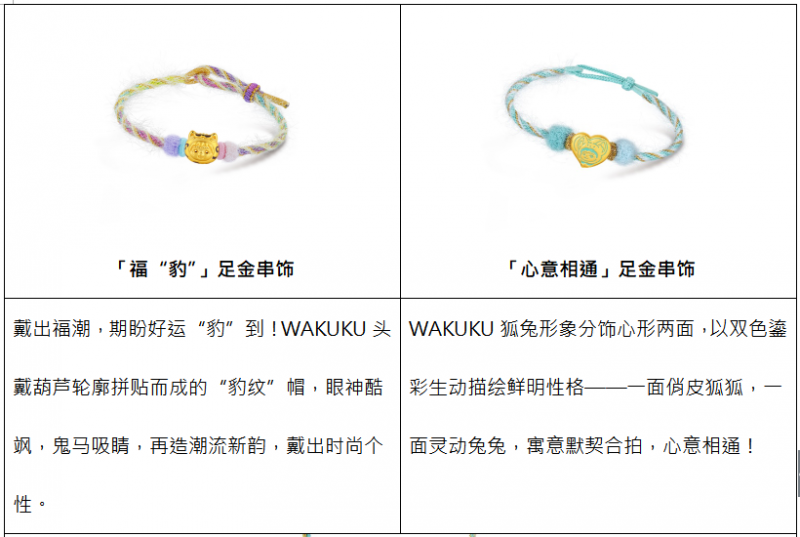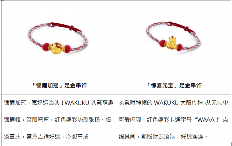 WAKUKU系列涵盖多款萌酷十足的黄金手绳,更特别推出萌暖毛绒手绳与酷感手绳双重选择,满足消费者对个性表达与场景适配的多元需求,风格不设限。萌暖毛绒手绳触感软糯,冬日佩戴温暖舒适,与WAKUKU的可爱气质天然契合,萌力全开!酷感手绳主打简约利落,清爽质感更凸显黄金串饰本身的精致工艺与闪耀光泽,时尚百搭!多款串饰还可自由组合,混搭叠戴。单戴时,祝愿福运聚焦,心意纯粹;叠戴时,祈望福气串联,美好加倍,做到“潮趣由你定义,祝福好运随心叠加”。