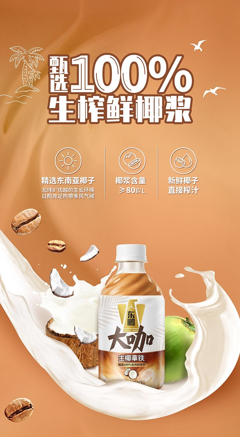 产品创新是东鹏大咖实现市场突围的核心抓手,延续了本土品牌“降低消费门槛”的破局思路,从价格与风味双维度贴合中国消费者需求。价格上,东鹏大咖紧跟即饮咖啡市场高性价比趋势,依托企业供应链优势实现成本控制,在品质与价格间找到精准平衡,契合大众日常消费需求,而2025年即饮咖啡新品百毫升均价较2024年下降30.38%的行业趋势,也为东鹏大咖的价格策略提供了市场土壤。风味上,东鹏大咖走饮料化创新路线,推出“生椰拿铁”等产品,精选100%生榨鲜椰浆,每升饮品中椰浆含量不低于80g,浓郁椰香与醇厚咖啡完美融合,让醒神的同时也能拥有愉悦的味蕾体验;阿拉比卡和罗布斯塔双豆黄金配比,在保留咖啡醇香的同时,通过椰浆的天然甜感降低糖分依赖,实现含糖量≤5g/100ml的低糖标准。针对职场人群的提神需求,其咖啡因含量稳定在≥20mg/100ml,且不含反式脂肪酸,兼顾健康与功效,既适配职场人群日常通勤、办公间隙的提神场景,也满足大众对健康饮品的核心诉求,真正做到功效与口感、健康三者兼顾。