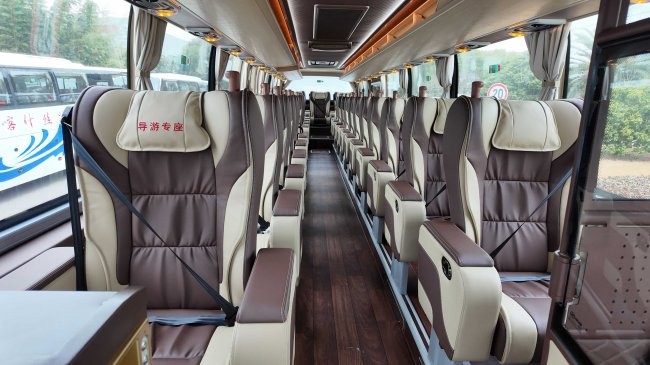 当被问及新V系还有什么打动人心的地方,何丽笑着提到了一个词——“移动影院”。车内采用“2+1”座椅布局,专为高端旅游市场量身定制。据介绍这批客车旨在满足国内精品游、长线游及个性化定制线路的需求,因此对车内空间、USB充电接口、饮水机及智能座舱系统等配置均提出高要求,以期为乘客带来更加卓越的旅途体验。并且新V系的内饰设计彻底颠覆了传统客车的沉闷。新中式风格、氛围灯、更符合人体工学的座椅,甚至被游客评价为像“移动影院”。