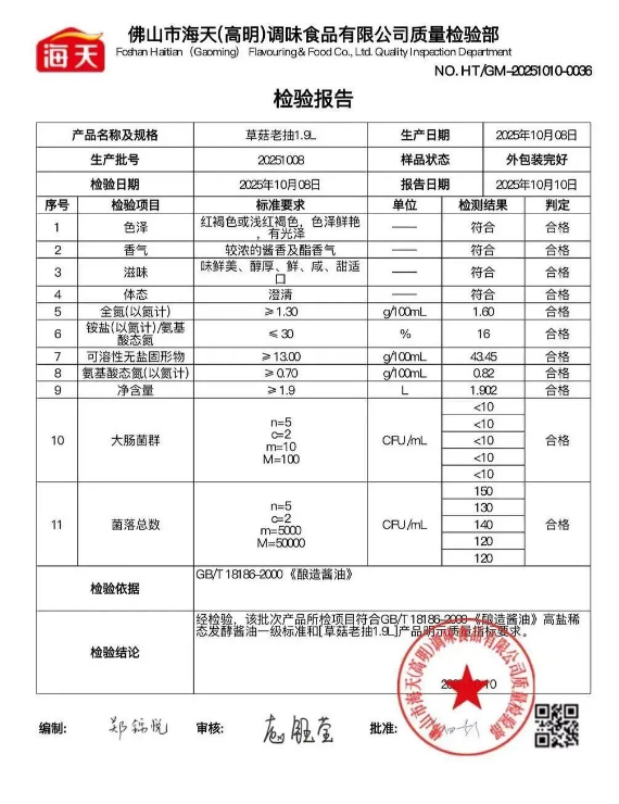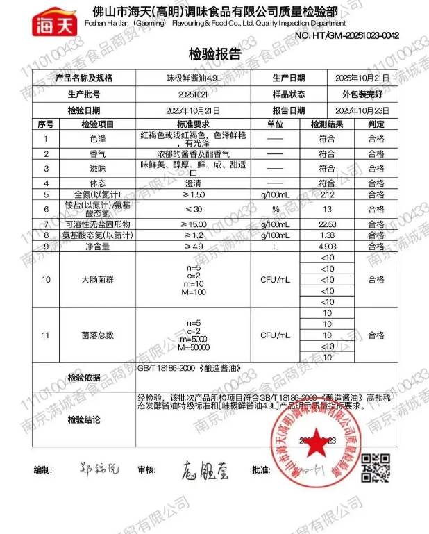 蚝油品类的测评结果与料酒、醋等细分品类中,海天产品的稳定性也得到充分验证。这种全品类的品质均衡性,得益于海天构建的“原料筛查—过程管控—成品检测”体系,每一瓶酱油都要经历494个质量检测点2000项检测,从源头筑牢品质防线。