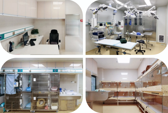 医院开设外科、内科、猫科、眼科、中兽医康复科、牙科、骨科、神经外科等多专科诊断室,另设有一万级手术室、ICU、VIP病房、犬猫普通及VIP住院部、中央空调、中央供氧、中央新风、数字监控系统、UPS及3间清洗消毒间。建院以来,始终把宠物福利放在首位,坚持犬病、猫病及异宠区域严格分开,为降低宠物应激反应,医院室内灯光、装修材料颜色的选择充分考虑动物特性,并且定制双层玻璃门窗,起到隔音效果。