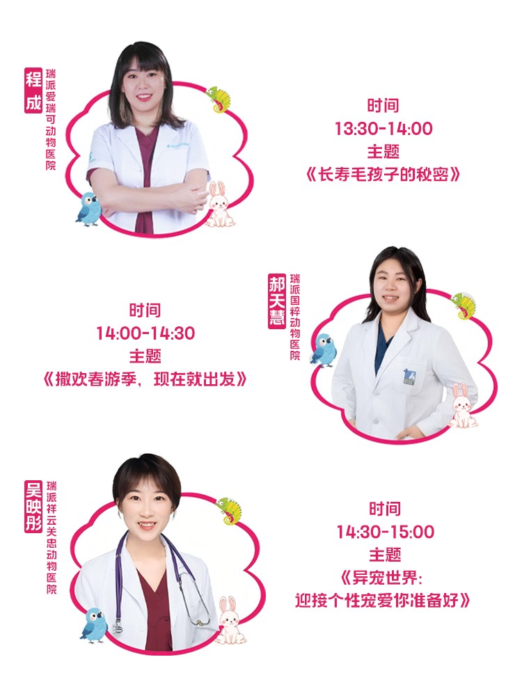 3月21日13:00至15:10,W2活动区将迎来瑞派明星宠物医生的专场科普课堂,围绕当下宠友最为关注的热门养宠话题,带来兼具专业度与实用性的知识分享。展会期间,专科医生团队亦将在展位轮值坐诊,提供一对一的现场咨询服务,沉浸式还原标准化宠物医院的日常场景,让专业触手可及。