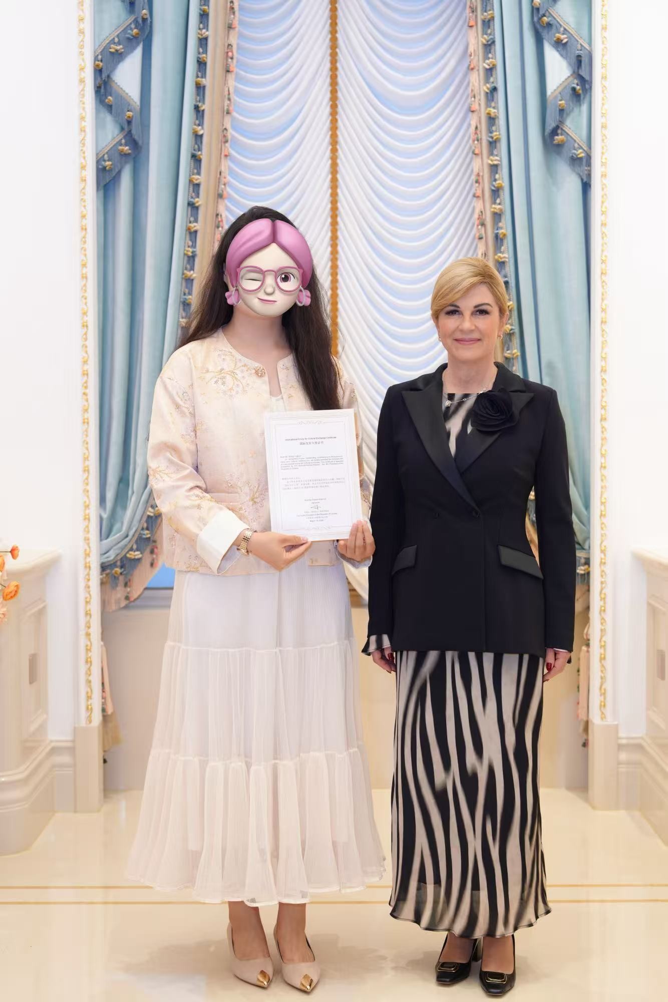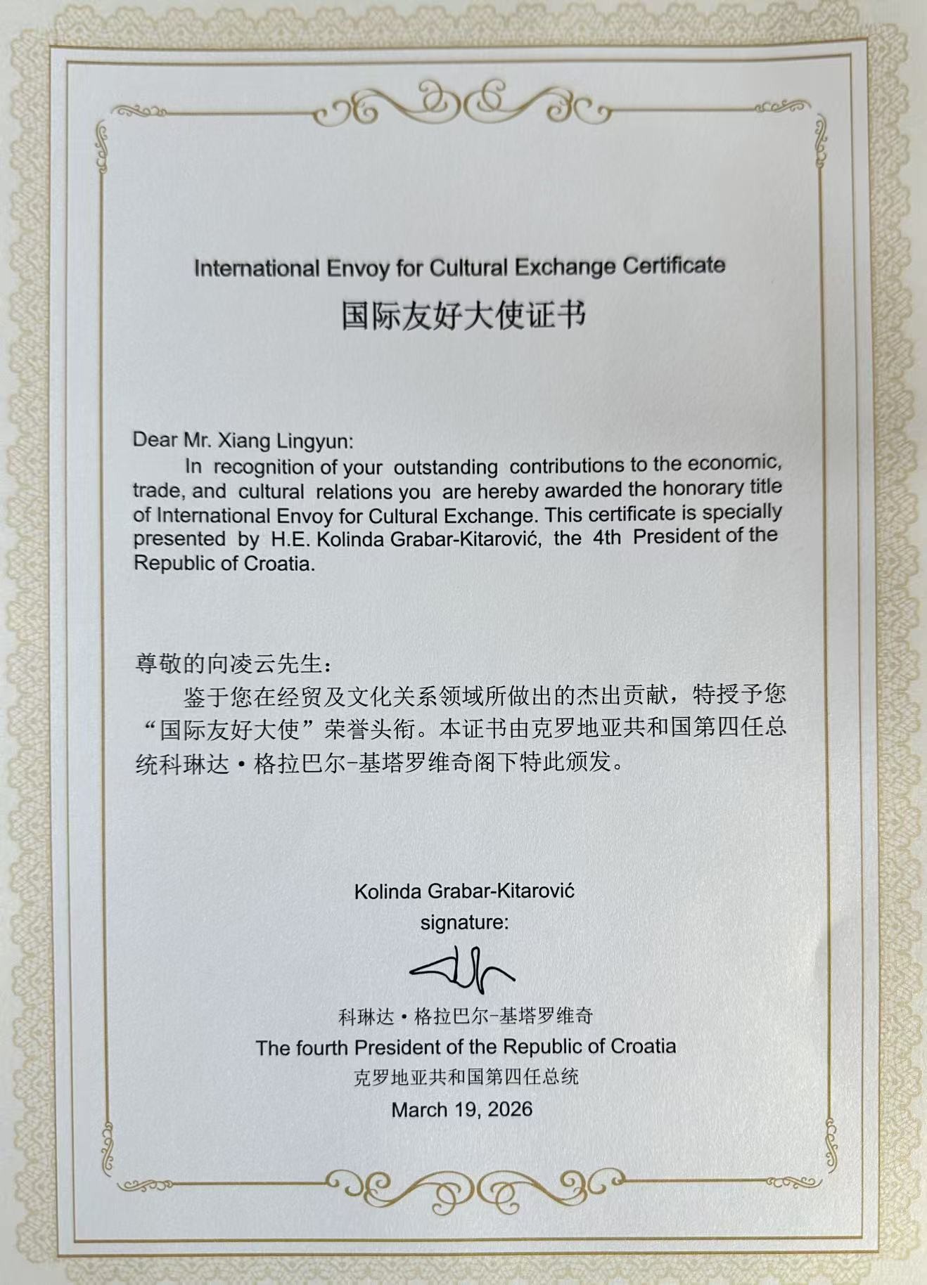 【2026年3月19日】 —— 著名旅美经济学家向凌云先生因其在推动全球经贸及文化关系领域所做出的杰出贡献,于今日正式获颁“国际友好大使”(International Envoy for Cultural Exchange)荣誉证书。该荣誉由克罗地亚共和国第四任总统科琳达·格拉巴尔-基塔罗维奇(Kolinda Grabar-Kitarović)阁下亲自签发并颁授。