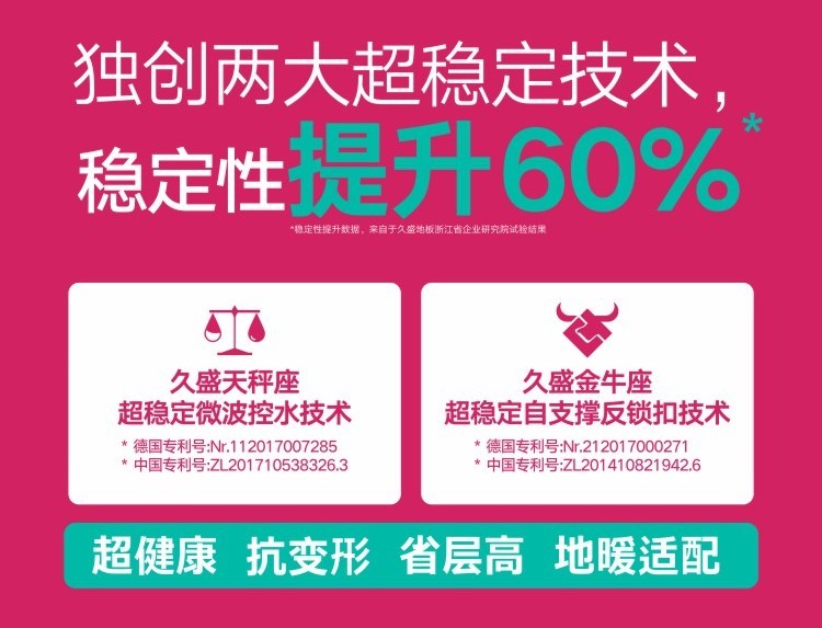 孩子的成长过程伴随频繁的活动与碰撞,对地板的耐用性提出了更高要求。久盛依托两大独创超稳定技术,稳定性提升60%,赋予纯实木地板超乎寻常的稳定性: