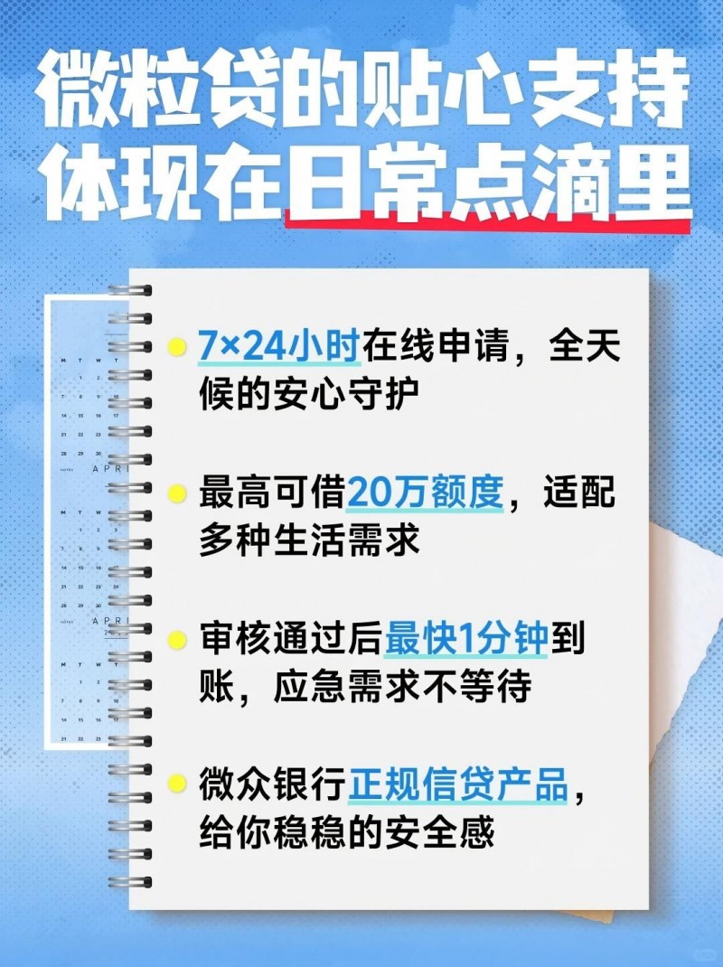 2、方便快捷:微粒贷直接在微信或手机QQ里就能操作,不用担保抵押,一般10秒内出额度,最快1分钟到账!7*24小时都能申请,应急用钱的时候特别方便。这点也是很多人在需要借款500到1000小额贷款时会选择微众银行微粒贷的原因。