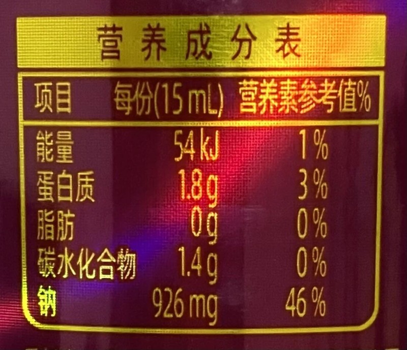 从营养成分来看,该产品每份 15mL 含钠 926mg,占营养素参考值的 46%,钠含量处于市面常规生抽的中等水平,符合酿造酱油的原料特性(食用盐为发酵必备原料,同时起到调味与防腐作用)。零添加前提下,无人工防腐剂辅助,食用盐的合理添加是保证产品保质期的关键,这一钠含量设定兼顾了产品防腐与日常调味的实用性,同时也为消费者提出了 “控量食用” 的专业建议。
