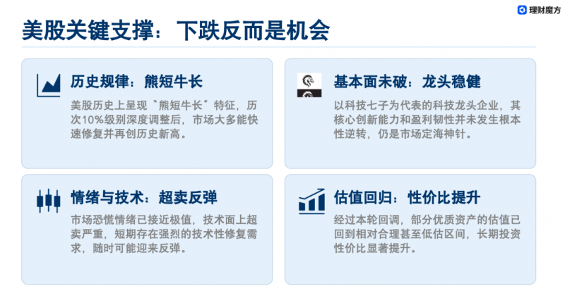 美股具备熊短牛长的历史特性,急跌后修复速度极快。以科技七子为代表的龙头企业,创新能力与盈利韧性未发生根本改变。市场短期超卖严重,存在技术性反弹需求。