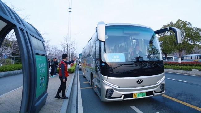 比赛当日凌晨,在有轨电车石帆站、环太湖自行车运动公园等多个接驳点位,贴有赛事标识的海格大巴早已就位,并于5:40准时发车,满员即走,高效运转。在7:35前,最后一班选手赛前接驳任务顺利完成,累计运送选手超过5600人次,确保了所有参赛者都能准时、从容地抵达起跑点。与此同时,高效的“点对点”接送服务也覆盖了赛道全点位,将560名志愿者等工作人员精准送达各自岗位,保障了赛事组织的井然有序。