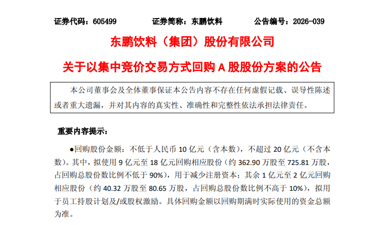 在消费复苏与功能饮料赛道升级的双重背景下,龙头企业的价值信号备受市场瞩目。东鹏饮料(605499.SH)发布回购股份公告,宣布拟以自有资金,通过集中竞价交易方式回购A股股份,回购金额不低于10亿元且不超过20亿元,回购价格不超过248元/股。值得一提的是,回购股份中不低于90%将用于注销并减少注册资本,剩余部分拟用于员工持股计划及/股权激励,这一方案一经披露,迅速引发市场广泛关注。